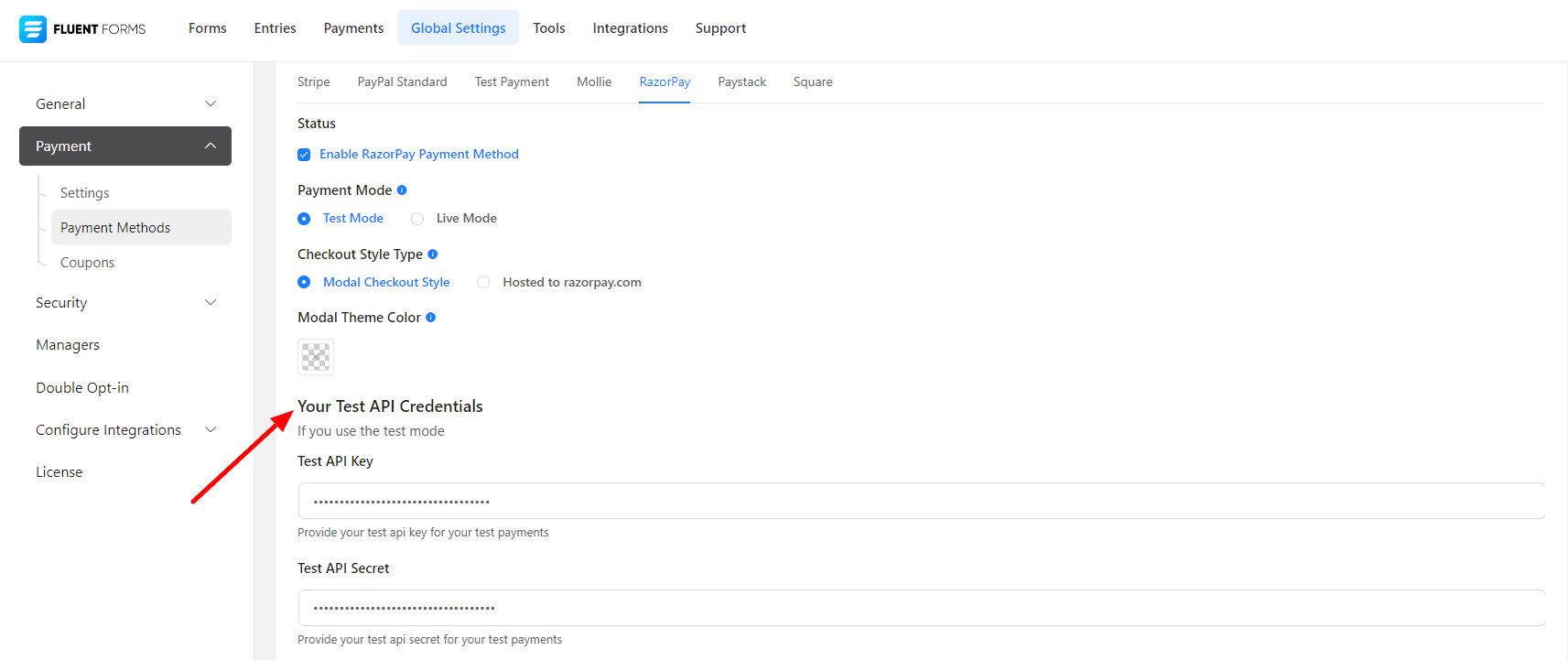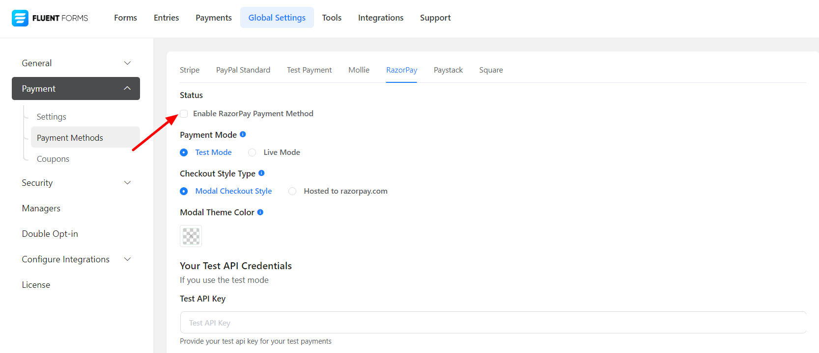 - In order to set up RazorPay with Fluent Forms, go to the Global Settings from your dashboard & select Payment Settings from the sidebar.