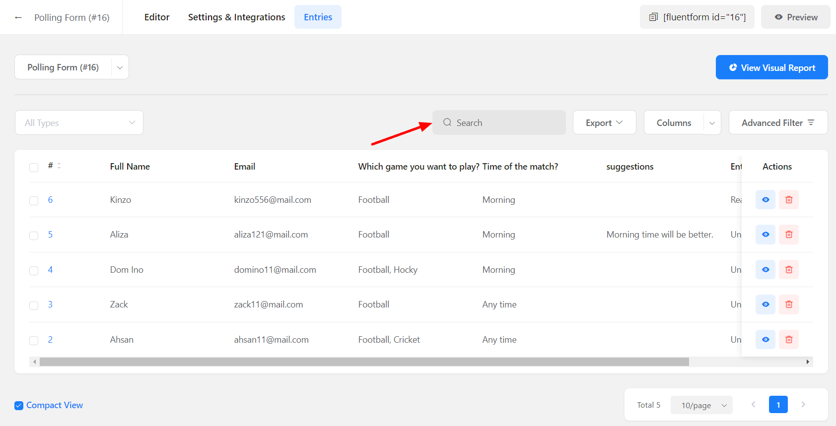 You can visit and manage all the submitted entries easily using Fluent Forms. Not only that, but Fluent Forms also enables you to export all of your contacts easily with just one click! And looking for one particular entry among thousands of them? Finding that needle in the haystack is made easy as well.