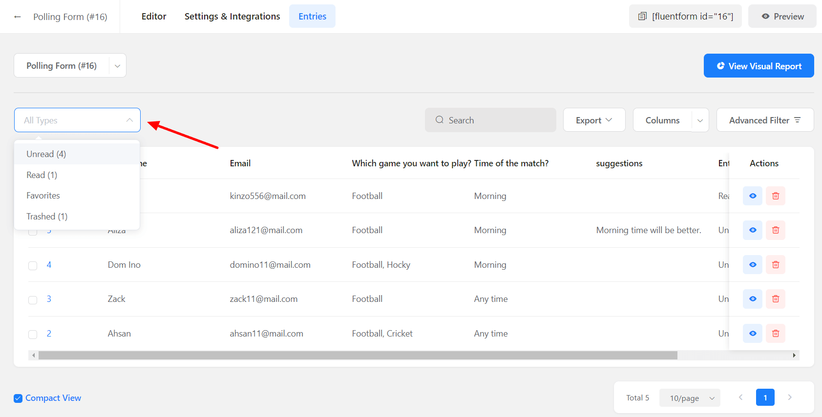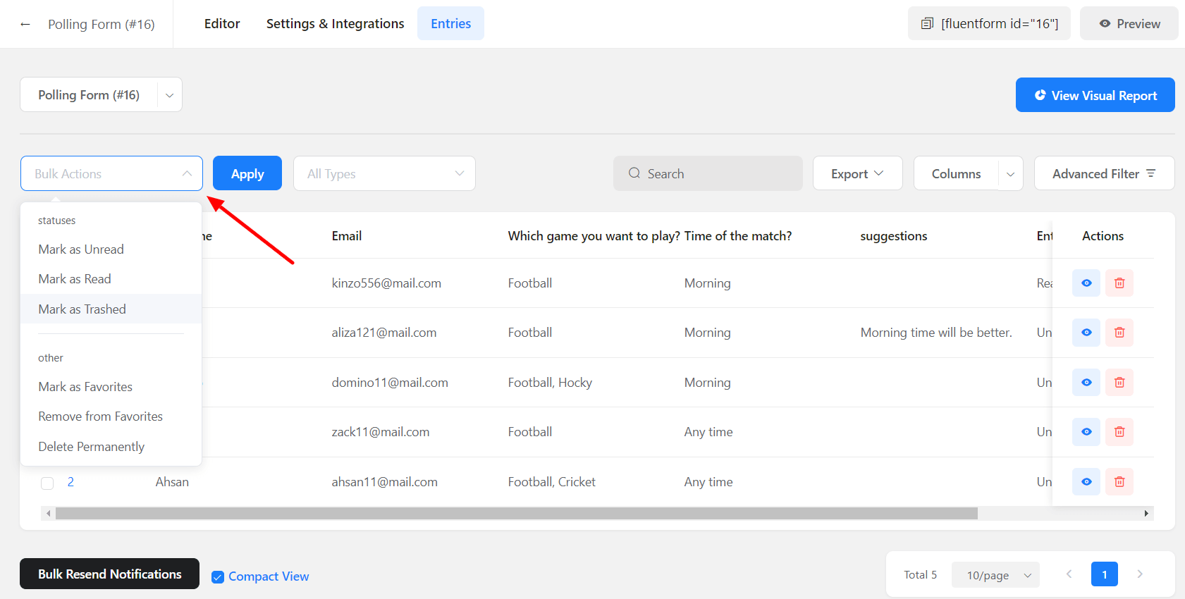 • Or you can go to Fluent Forms (sidebar) → Entries and then select the form from the drop-down menu to see the entries for that particular form.
