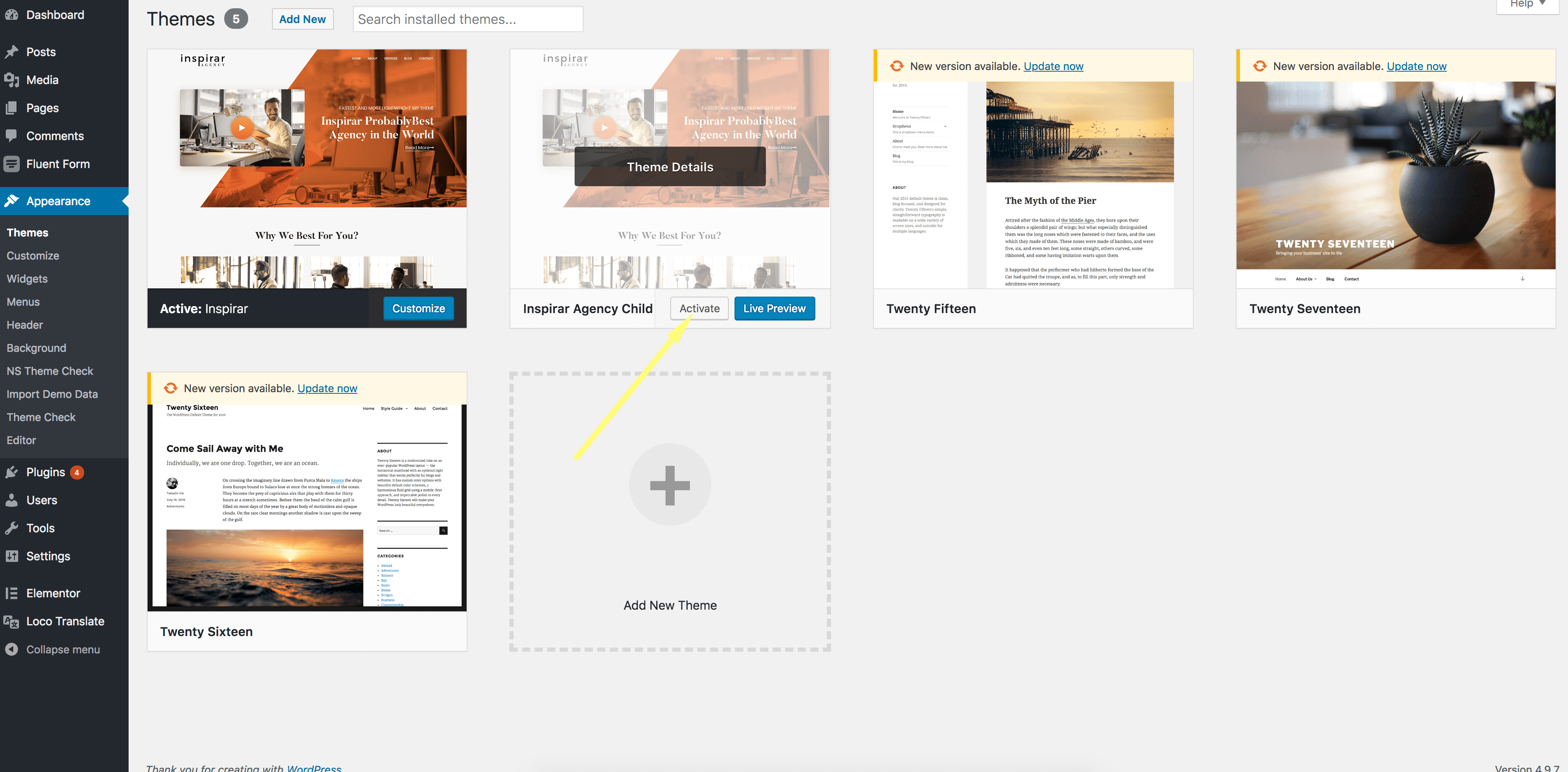 Once the installation is complete, your Inspirar theme will be ready for use. Now all you need to do is navigate to Appearance > Themes and activate the Inspirar child theme. After you have done this, you should see there two more themes called Inspirar and Inspirar-agency-child. Find it and just click Activate (if the theme was uploaded via FTP).
