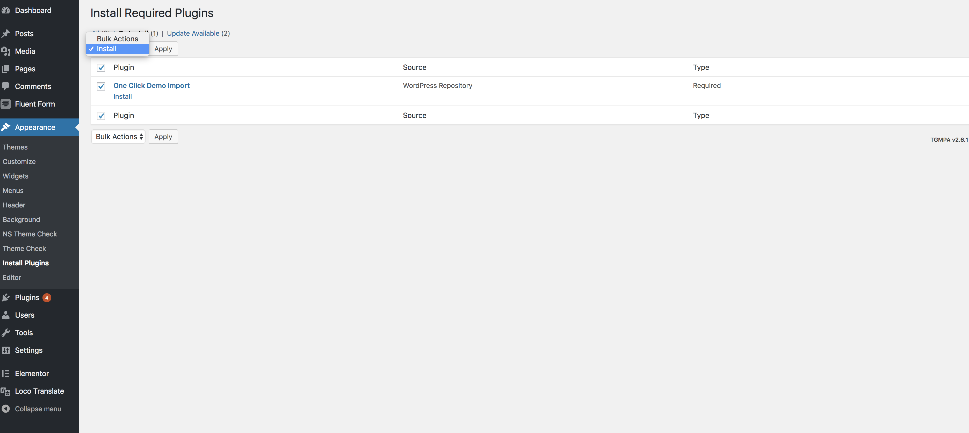 After you have done this, you should also see the notification that appears in the left navigation bar of your WordPress admin panel. It requires plugins that need to be installed. Please install and activate all of the required plugins, since they are necessary for the theme to function properly.
