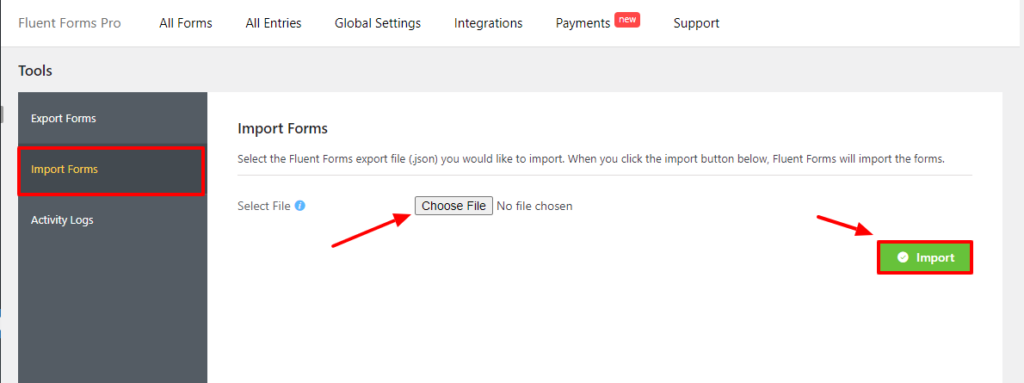 - Navigate to WP Admin -> Fluent Form -> Export/Import.