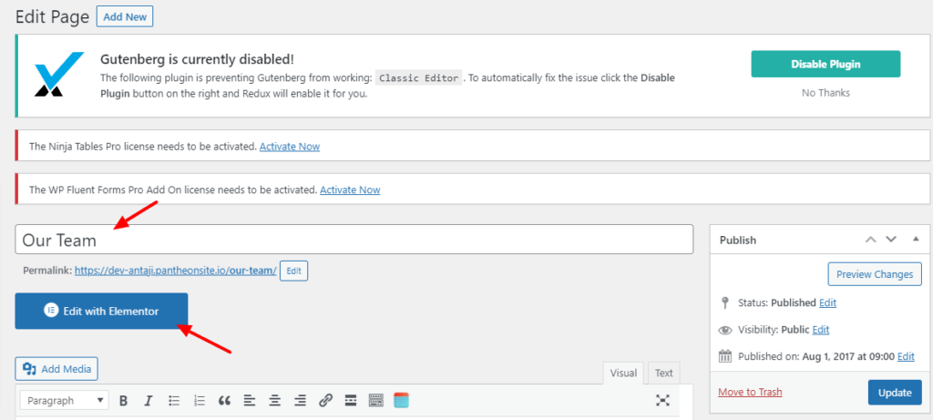 Look for the Edit With Elementor button on the top of the page. Click on it to enable the Elementor page builder view.