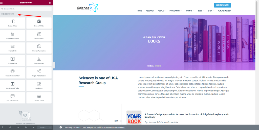 Particularly we have a custom Elementor Widgets Panel for only Science-X.