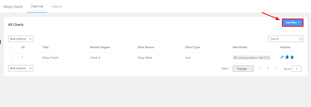 At first, go to your Ninja Charts dashboard & click on the Add New button to add a chart. Here, you can enter your Chart Name & choose the rendering engine using the Chart Renderer option. You can choose either Google Charts or Chart Js.