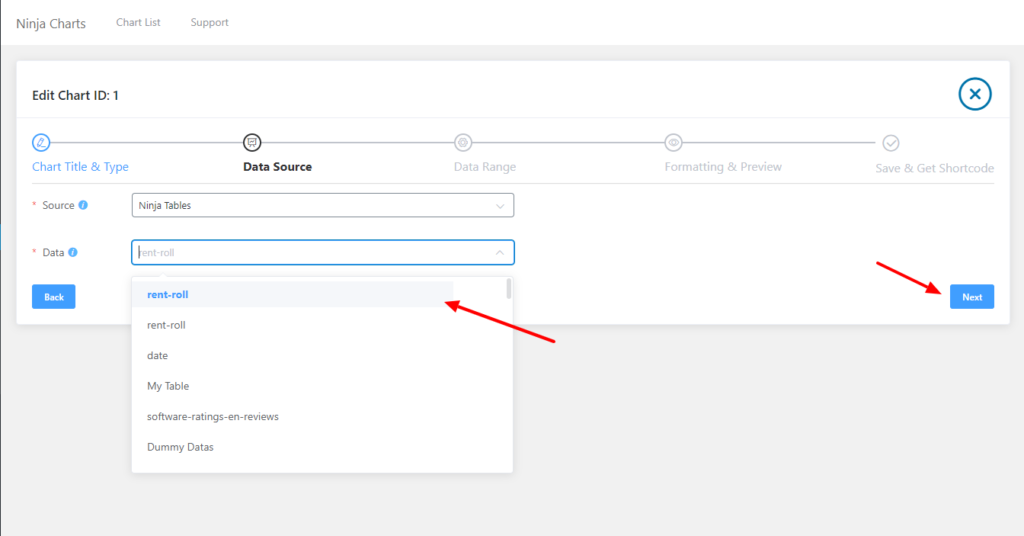 After clicking next, you have to select the source of data from the Source option. There are three options; Manual Input, Ninja Tables & Fluent Forms. Here, Ninja Tables has been chosen as the data source as an example.