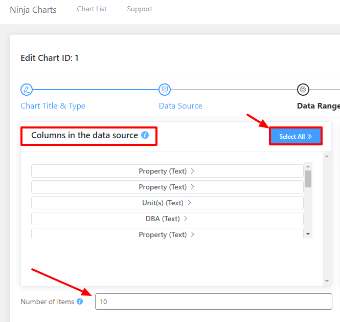 At first, you need to ensure that you have completed the two other previous steps. In this step, you can select the Columns in the data source. By choosing columns that you want to use in the chart. Click on the Select All button if you need to. You can enter the number of items in the Number of Items option. By default, the last 10 items are selected, for all items just put 0.