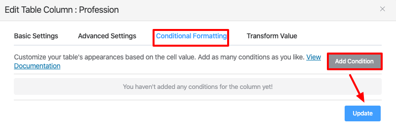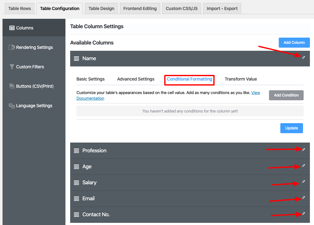 There are two methods to configure Conditional Formatting. Either you can set it by changing columns one by one in the Table Configuration menu,