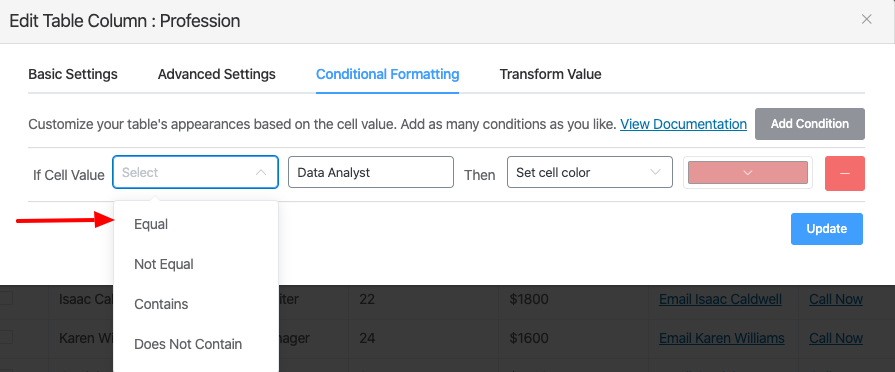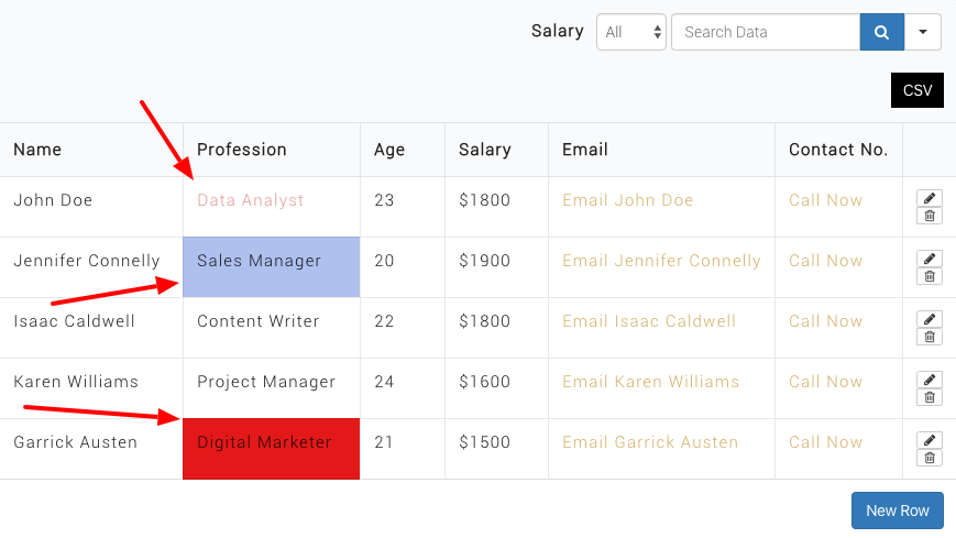 You can also remove conditions you just placed by clicking the Subtract button(-) given on the right side of the popup window. The image below shows a demonstration of how to put conditions. Here the background color of the Data Analyst & Sales Manager in the Profession will be added. Then the text color of Digital Marketer will be changed.