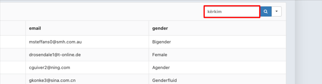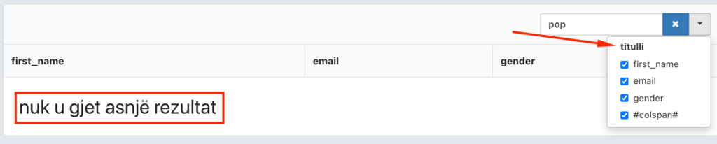 In the final step, you just have to preview the output to see the results of your table. In the table given below, words are set to Albanian in the search placeholder, when the table rows are empty & in the dropdown heading.