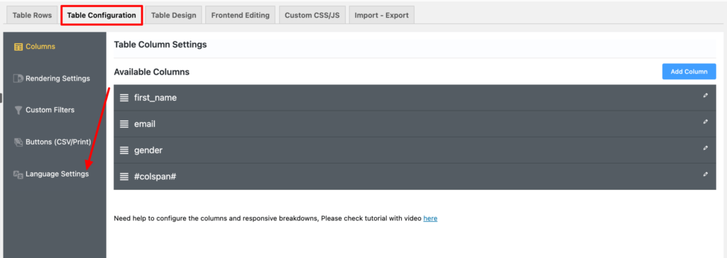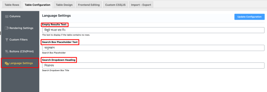 The first step is to click on the Table Configuration tab, here you will find the Language Settings on the left side like the example given below: