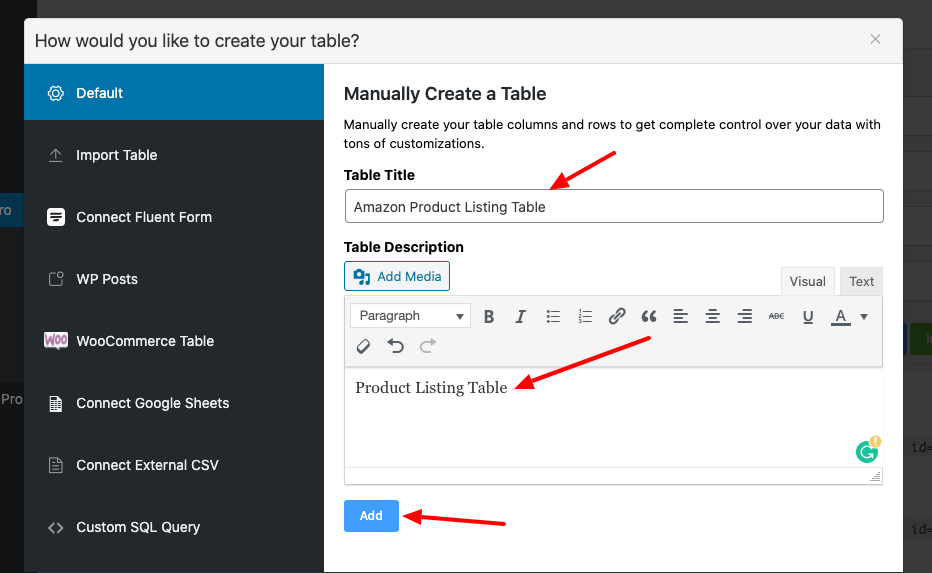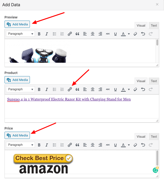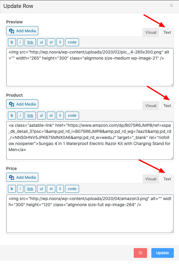 Data is added to the relevant table column. By clicking the “Add Media” button, we can insert an image. By visual / text editor, you can also connect to a text so that you can make affiliation with your desired affiliate site.