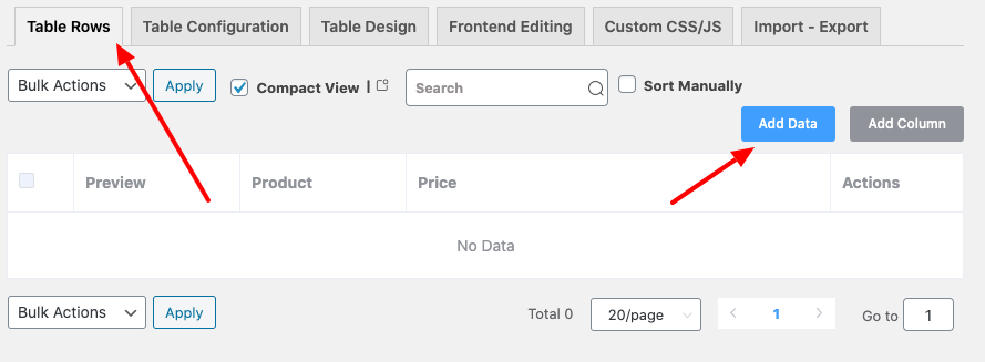 Then you need to input necessary info into the relative columns. In order to do that, click over Add Data on the Table Row segment.