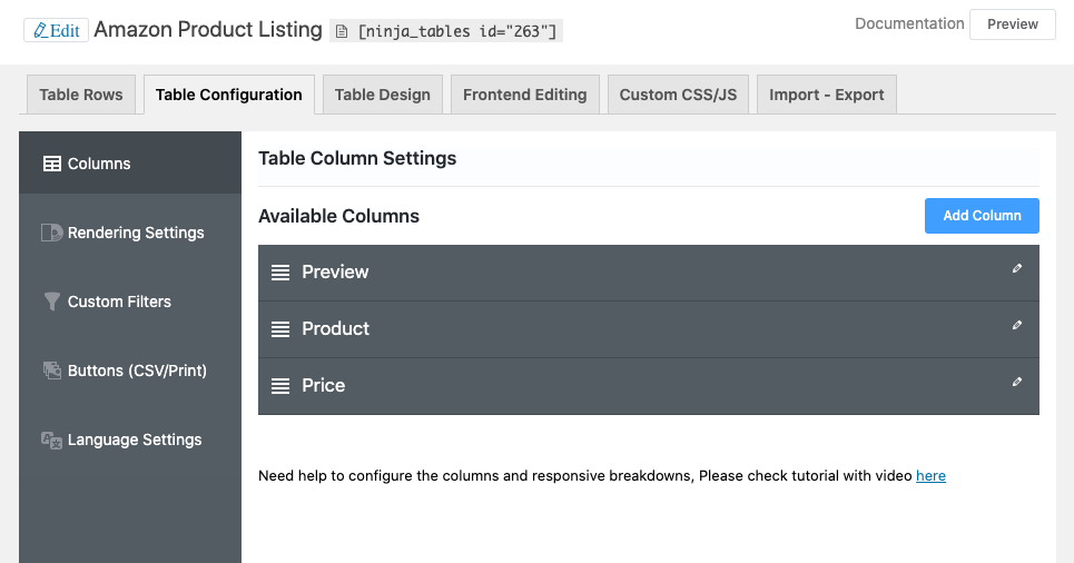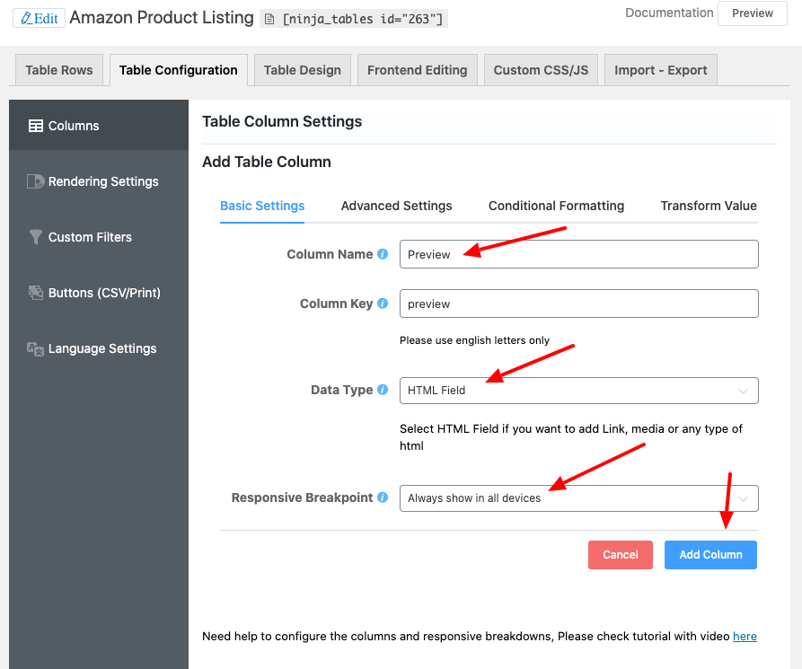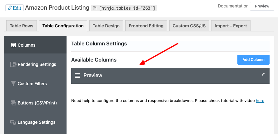 Start making columns after creating the table in the table configuration tab. And click the Add Column button.