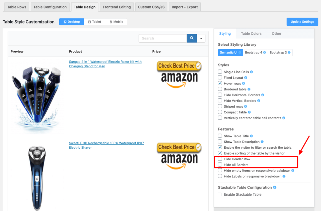 You can also add more columns and data as needed. Clicking a single button may also clear the border. In order to do this, go to “Table Configuration” at the top of the page and check the “Hide all border” option in the “Other Setting” section on the right sidebar.