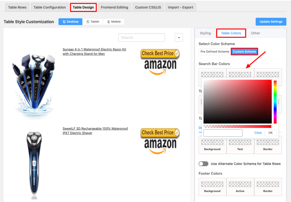 There are various ways to customize color, so go to the Custom Schema section of the Table Colors tab to make this possible. To get a clear idea the screenshot is provided here.