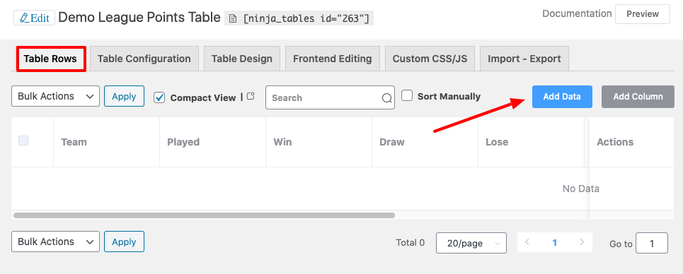 7. Using Ninja Tables you can configure the tables in various ways. The example is about League Points Table, and these tables are usually presented in a certain order. Hence it is recommended to choose the Points column in your Data Sorting option and select the sorting type in Descending Way. The table will structure itself by placing the team with the highest point on top, and the one with the lowest point at the bottom.