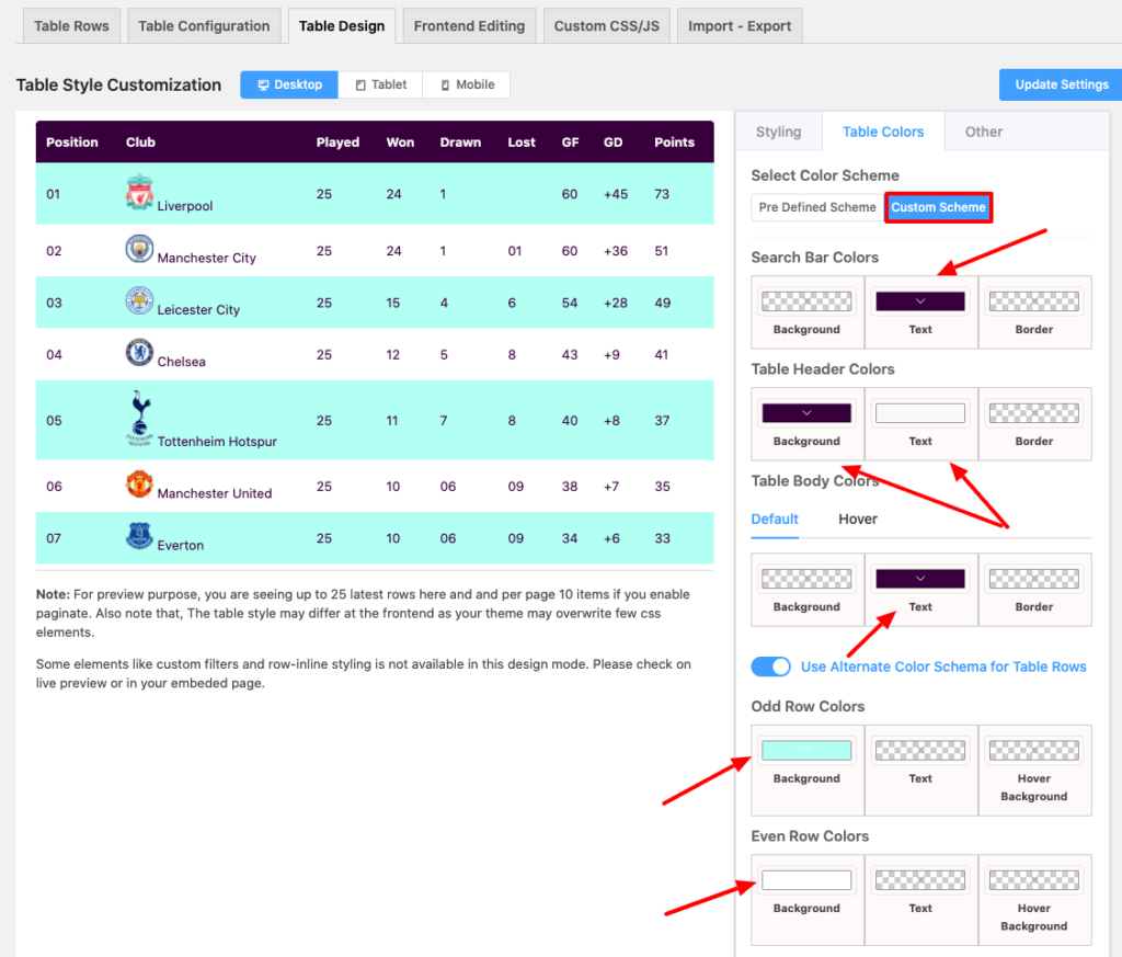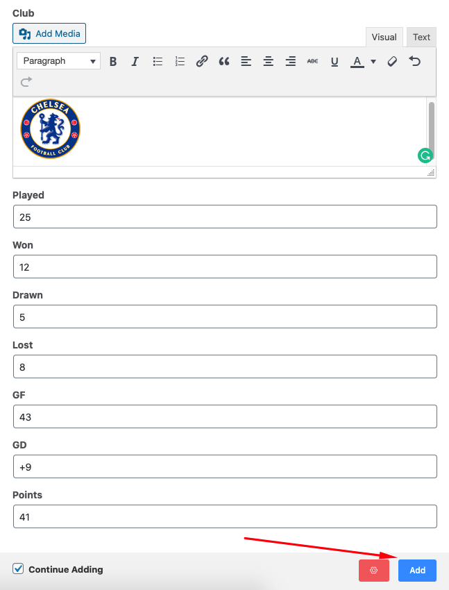 A Sports League Table can be created with the help of Ninja Tables. Which can be implemented quite simply. In order to do this, you just need to enter the Team names & add/edit their corresponding scores relative to the teams.