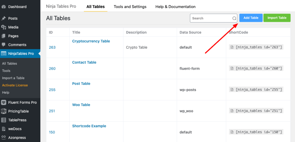 1. First of all, navigate to Ninja Tables in your WordPress dashboard’s sidebar. Here, click over All Tables and then click on the Add Table button.