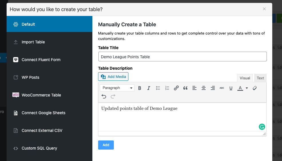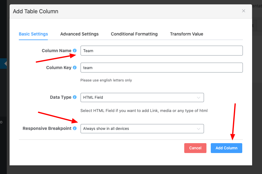 3. Click on the Add Column button to create columns. Then add columns to the table by naming and setting their data types in the pop-up window. Such as columns named Points, Matches Played need to have the data types as Numeric Values. And the column Team Name needs to have Single Line Text Field/Text Area/HTML Field as the data type.