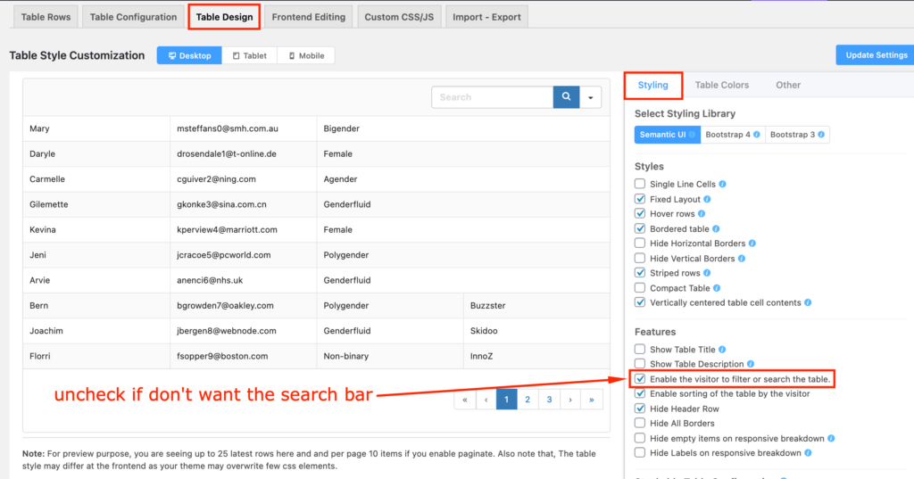 3. Toggle the “Enable the visitor to filter or search the table” option on/off. This is how you can add or remove Search/Filter functionality using Ninja Tables plugin.