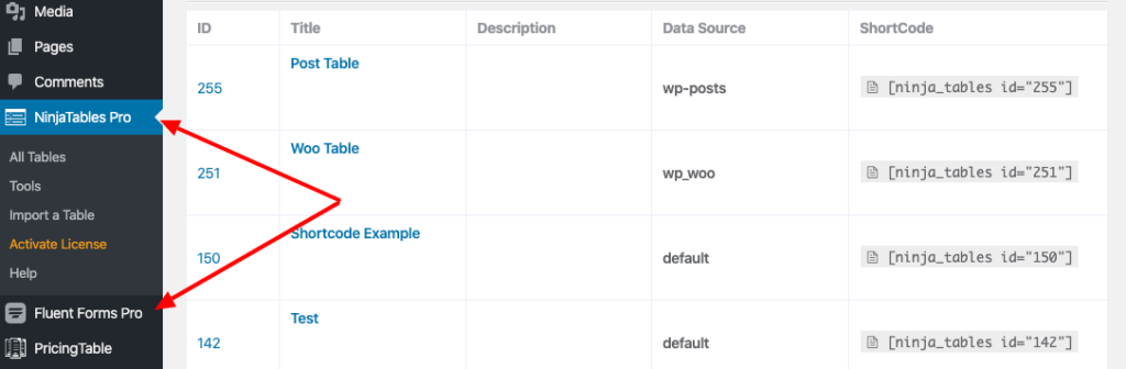 In the dashboard being used for demonstration, both the Ninja Tables and Fluent Forms are installed beforehand.