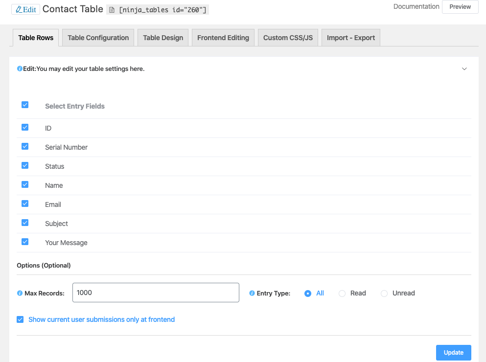 If you choose to use Ninja Tables just to display your own submissions. Just activate that from the configuration settings for Table Rows.