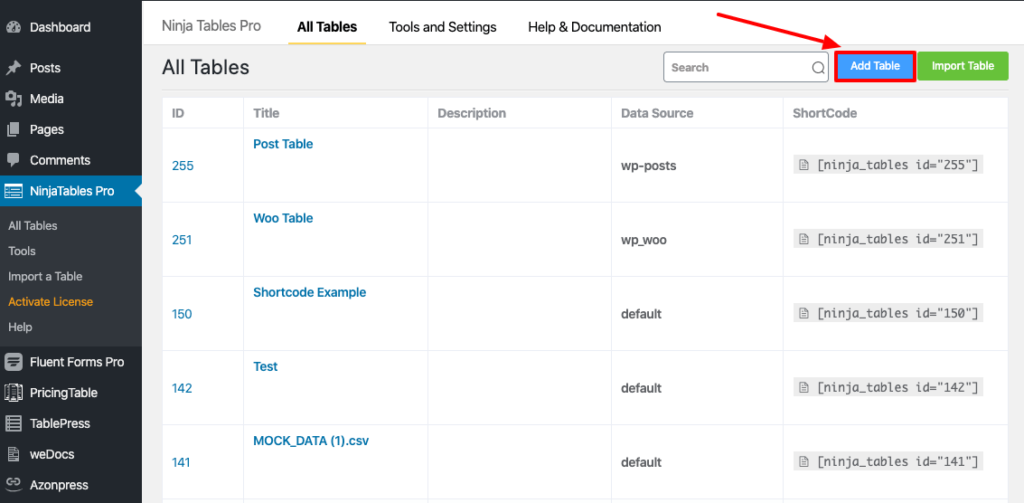 From the above image, you will notice that all the required data has been entered in the form. Then these entries will be displayed into the Ninja Tables. In order to configure the entries in the front-end, go to the Ninja Tables dashboard and click on Add Table