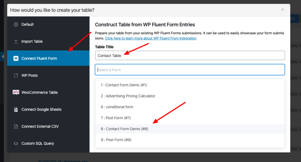 A pop-up box will show up on the screen after that. Click “Connect Fluent Form” from there, and give a title to your table. Then choose your preferred form using the box “Select a form” like the image below.