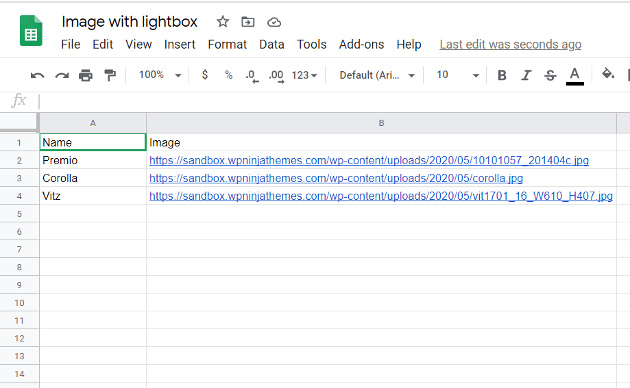 For demonstration purposes, a table has been imported to Ninja Tables from Google Sheets. This table contains information about various car models. It consists of two columns called Name & Image.