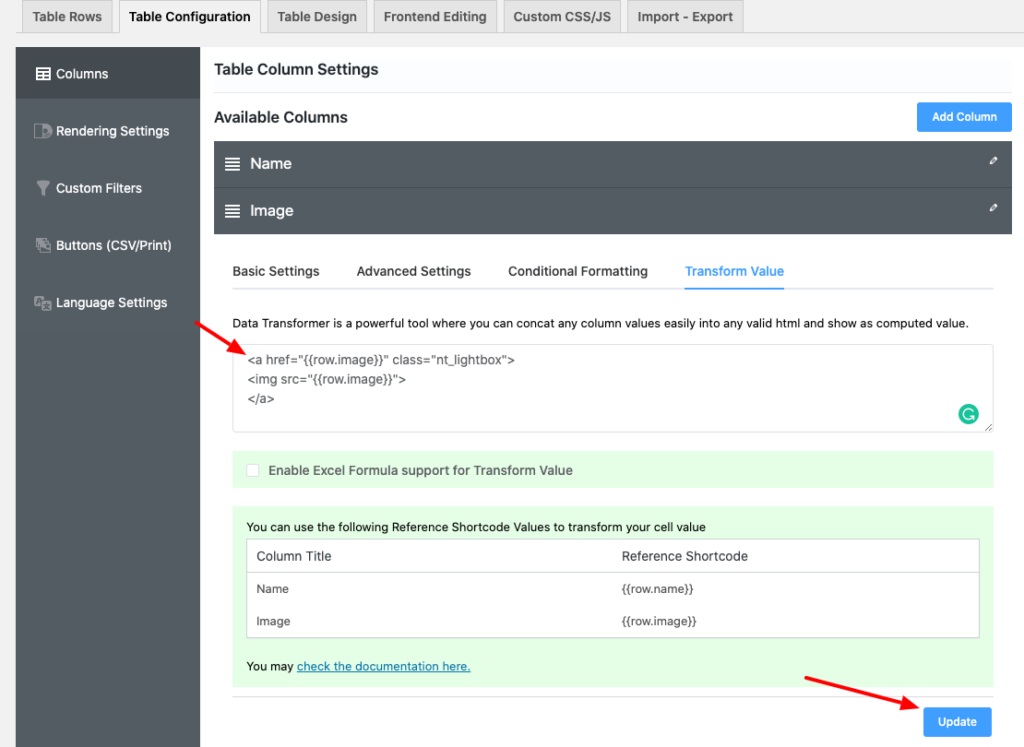 Now to turn this image link into an Image. Replace the Image Shortcode with the Column Shortcode of the Image column given in the Transform Value option. To learn more about the Value Transformation feature read this documentation.