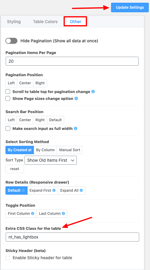 Next, go to the Table Design tab and click on the Other option. Then you will find an input field called Extra CSS Class for the table, add this class nt_has_lightbox here. Lastly, click on the Update Settings button to save the settings. Take a look at the example given below: