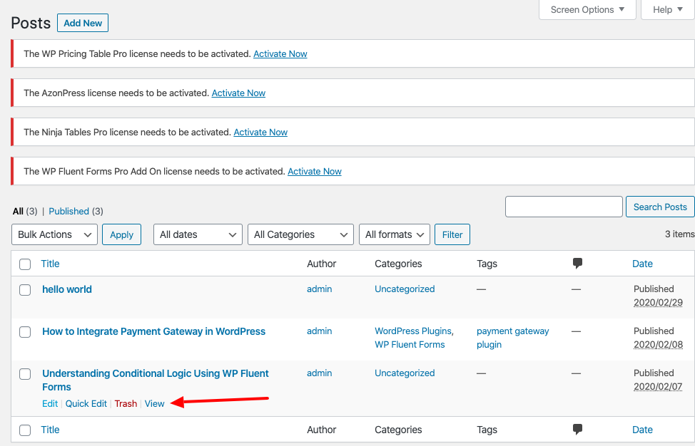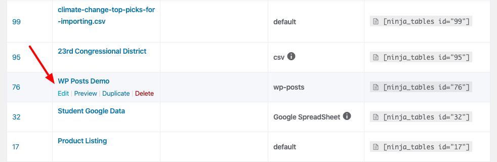 Then, go to the plugin Ninja Tables and click on the Post table generated using the WP Post feature. Select the post table edit icon from the plugin dashboard.