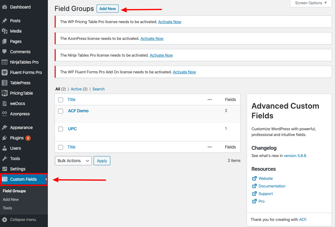 The first step is to install a plugin named Advanced Custom Field, from the WordPress plugin directory. Next, go to the plugin option located on the left sidebar on the dashboard.