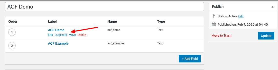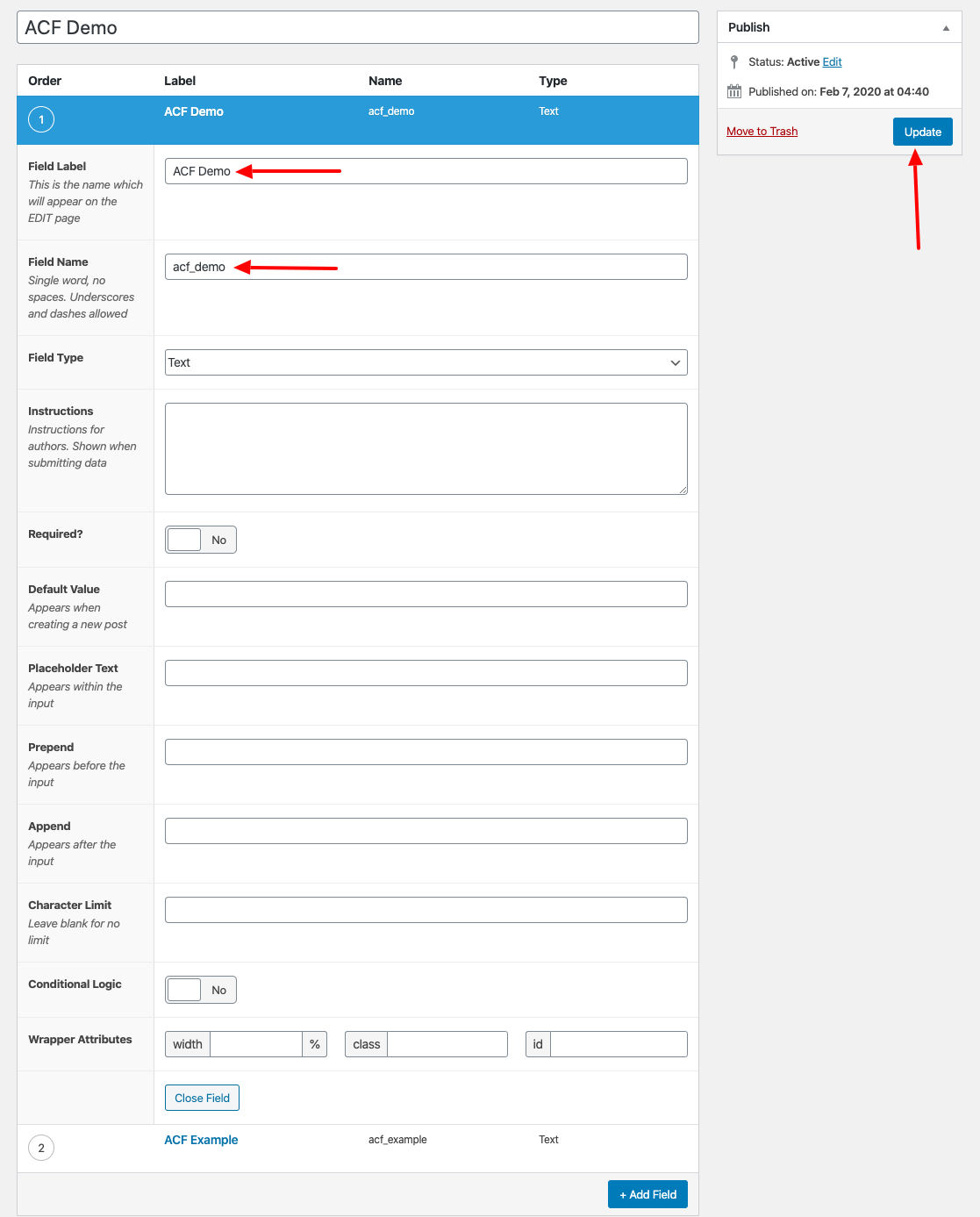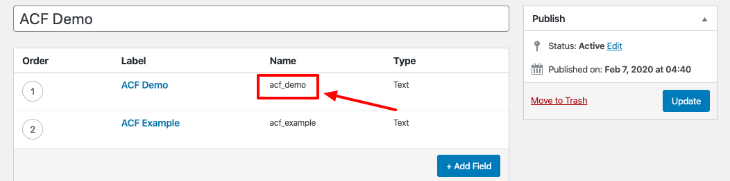 Click on the Add New button from the plugin’s dashboard. Then go to the Add Field button after giving the title of the new field group. In the input field, enter the Field Label & Field Name. After that click on the Publish/Update button in order to publish the post.