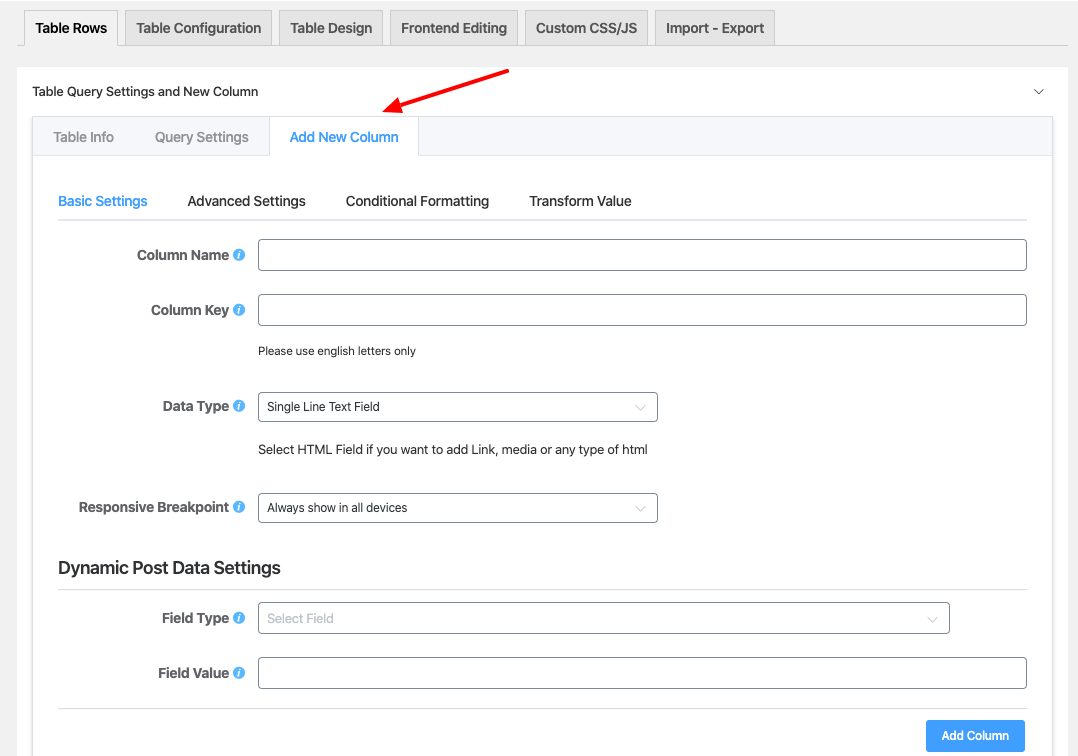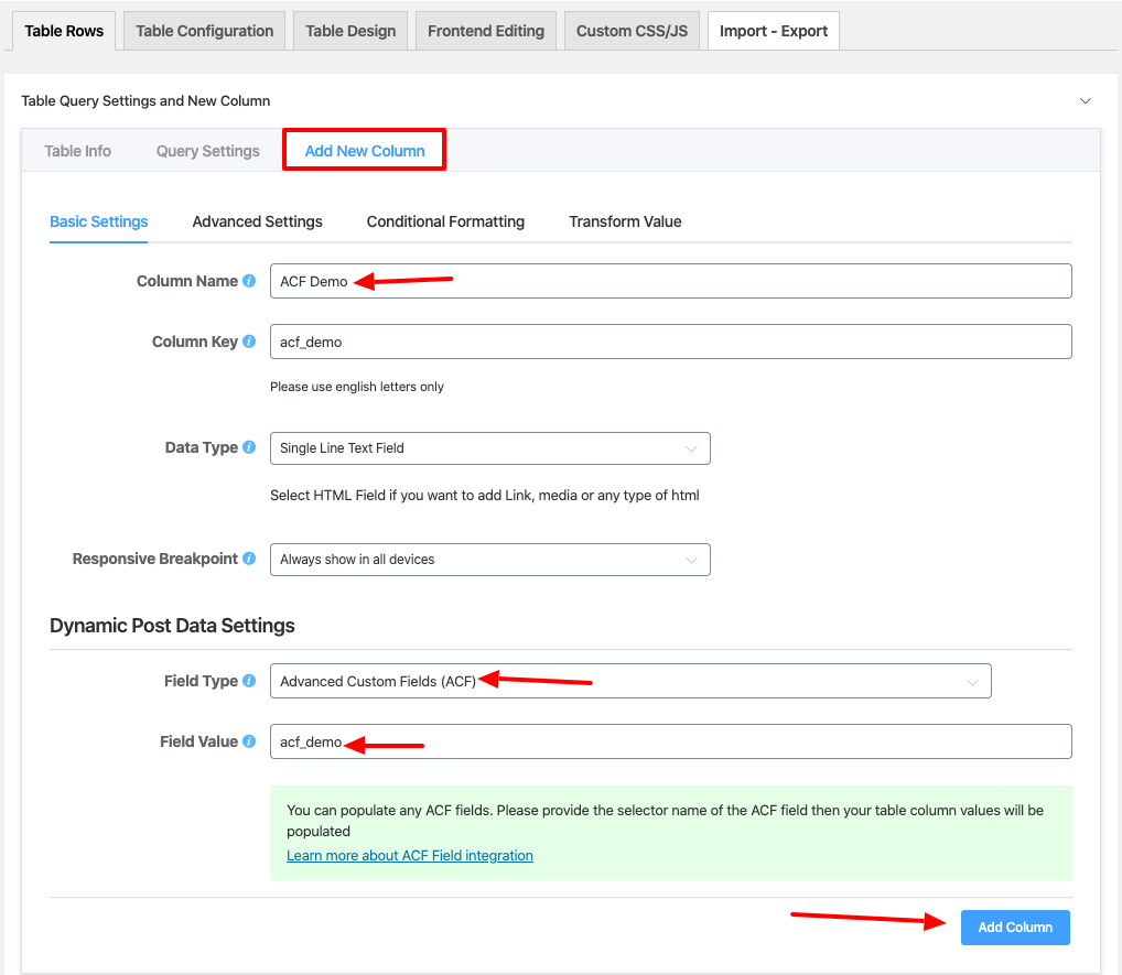 A drop-down menu will be visible, where you will see the Field Type Option. Here, select the Advanced Custom Fields(ACF) option & enter the respective value in that field. Next click on the Add Column button.