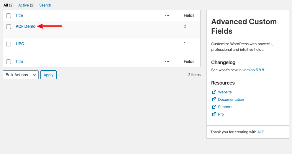 Remember that in the Field Value input area, enter the value from the Name column in the Advanced Custom Fields plugin dashboard according to your created Field Group.