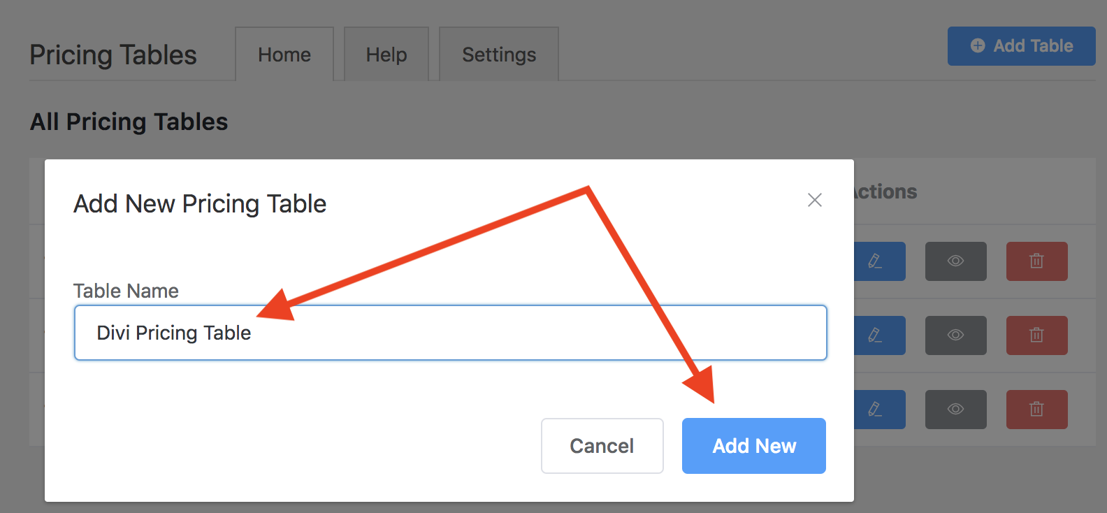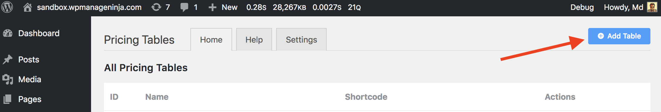 Then you will have a dashboard of the plugin and click on the Add Table button to create a new pricing table.