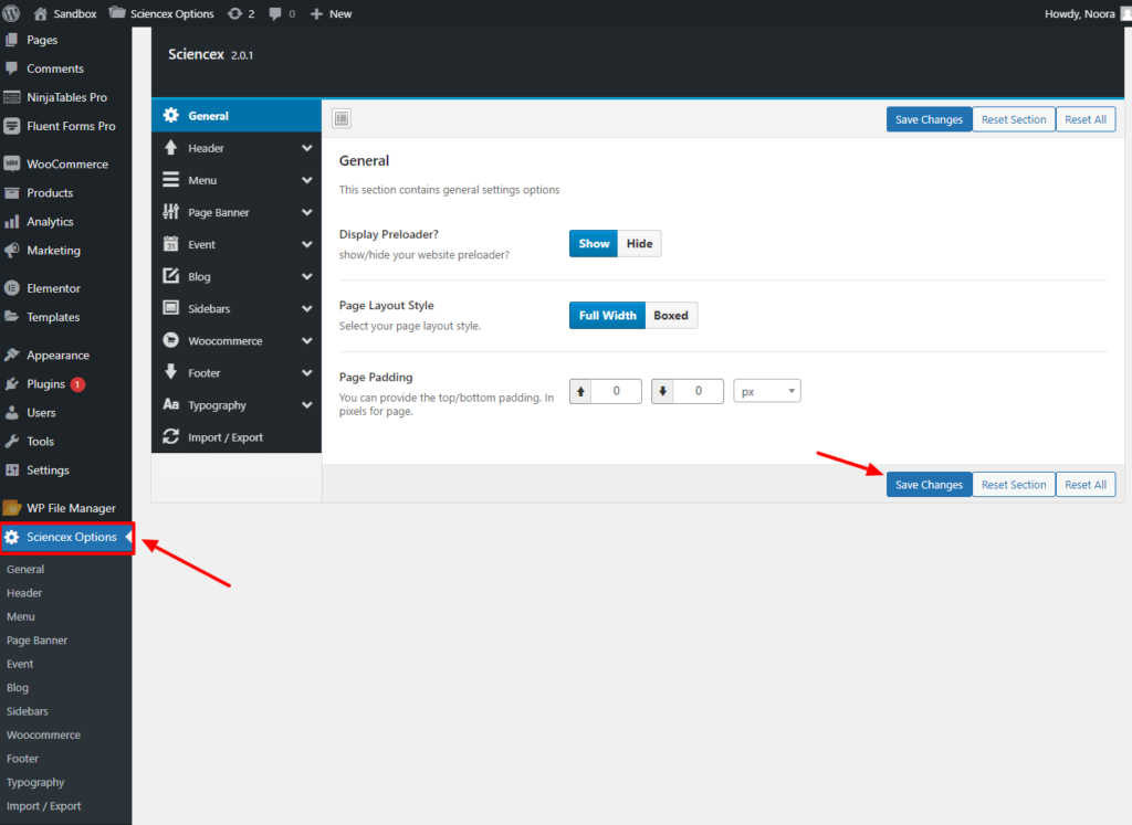 Notice: Before leaving the ‘Theme Options/Science-X Options’ tab make sure to click the ‘Save changes‘ button at the top of the panel, otherwise your changes will be lost.