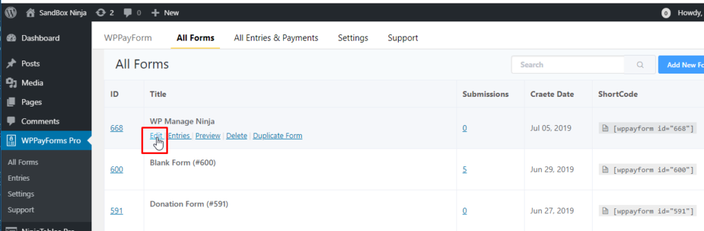 The first step is to go to your WordPress dashboard. Then click on All Forms under the WPPayForm plugin. And click on the Edit button by hovering over your form.
