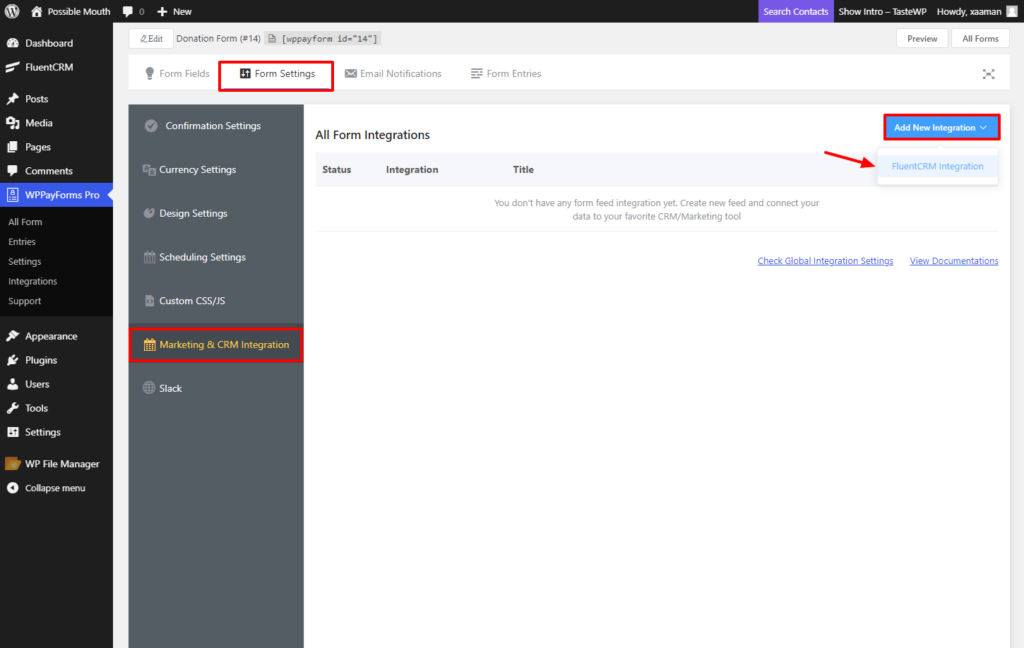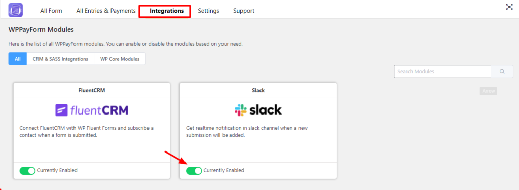 Then go to your WPPayForm dashboard and go to the Integrations option. Scroll down to the FluentCRM module & turn on this module.
