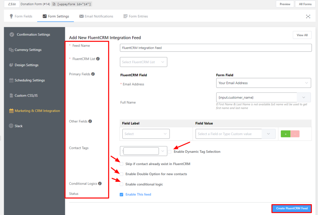 Other options include Enable Dynamic Tag Selection, Skip if contact already exist in FluentCRM & Enable Double Optin for new contacts. Allow FluentCRM integration conditionally based on your submission values using Conditional Logics. Lastly, check the Enable This Feed option and click on the Create FluentCRM Feed button.