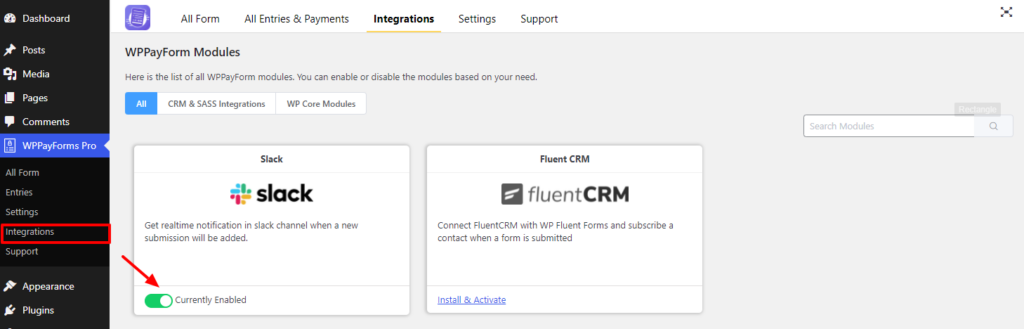• Start by enabling the slack module from the WPPayForms (Pro) Integration modules.