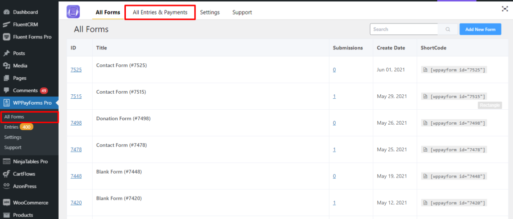 To make this happen, you need to go to the plugin dashboard first, then click on the Entries option located in the left sidebar or you can click on the Entries & Payments tab on the top of the dashboard.