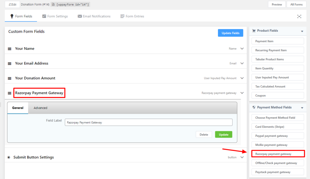 Now you have to create a form & add your required fields. And add your desired labels for them. On the Payment Method field, click on the Razorpay gateway payment option to let your users pay through this Payment method.