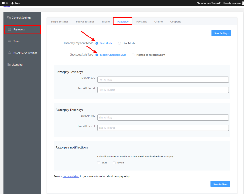 At first, for the integration to work you need to have an API key. And if you don’t have a RazorPay account, then you should sign up for one now. In order to set up RazorPay with the plugin, go to the Global Settings from your dashboard & select Payments from the sidebar. Next, go to Razorpay Settings.
