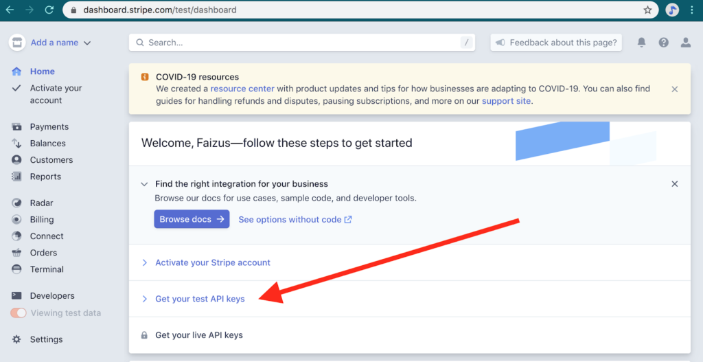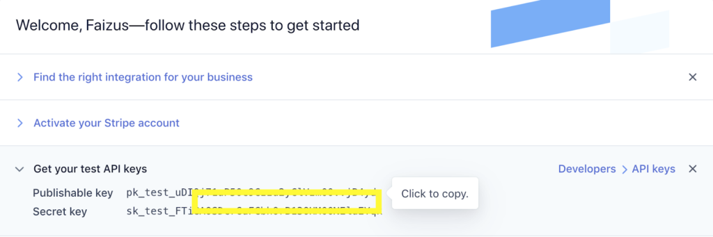 Then you will have to provide the test API keys. So login to your Stripe account to fetch these keys. Click over Get your test API keys.