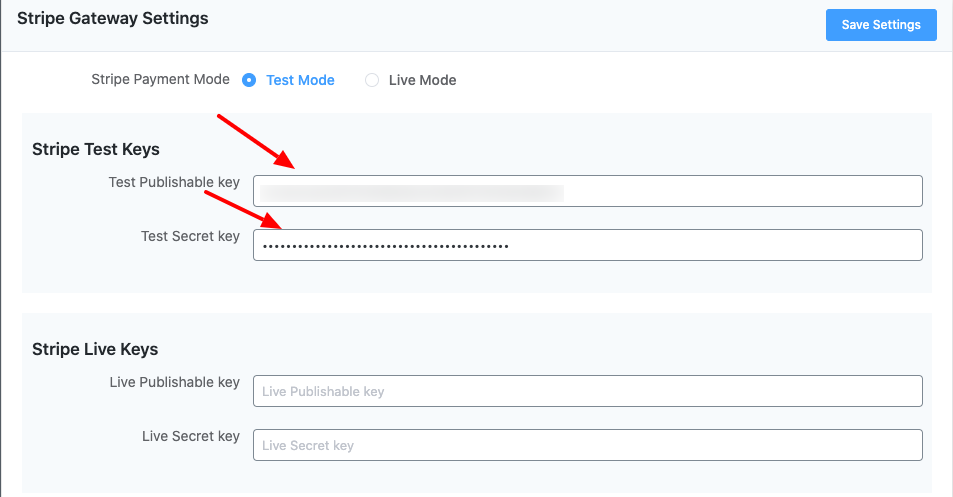 In the Stripe Gateway Settings, you can choose the Stripe Payment mode. It can either be Test Mode or Live Mode. In this example, the Test Mode has been used.