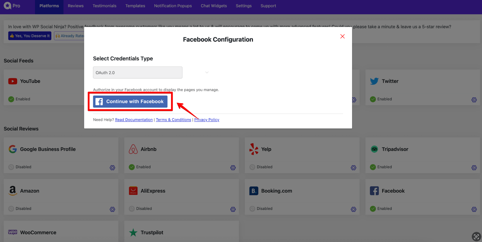 You first need to authorize your account to connect the Facebook feed to your website. Simply click the Continue with Facebook button to authorize the procedure.