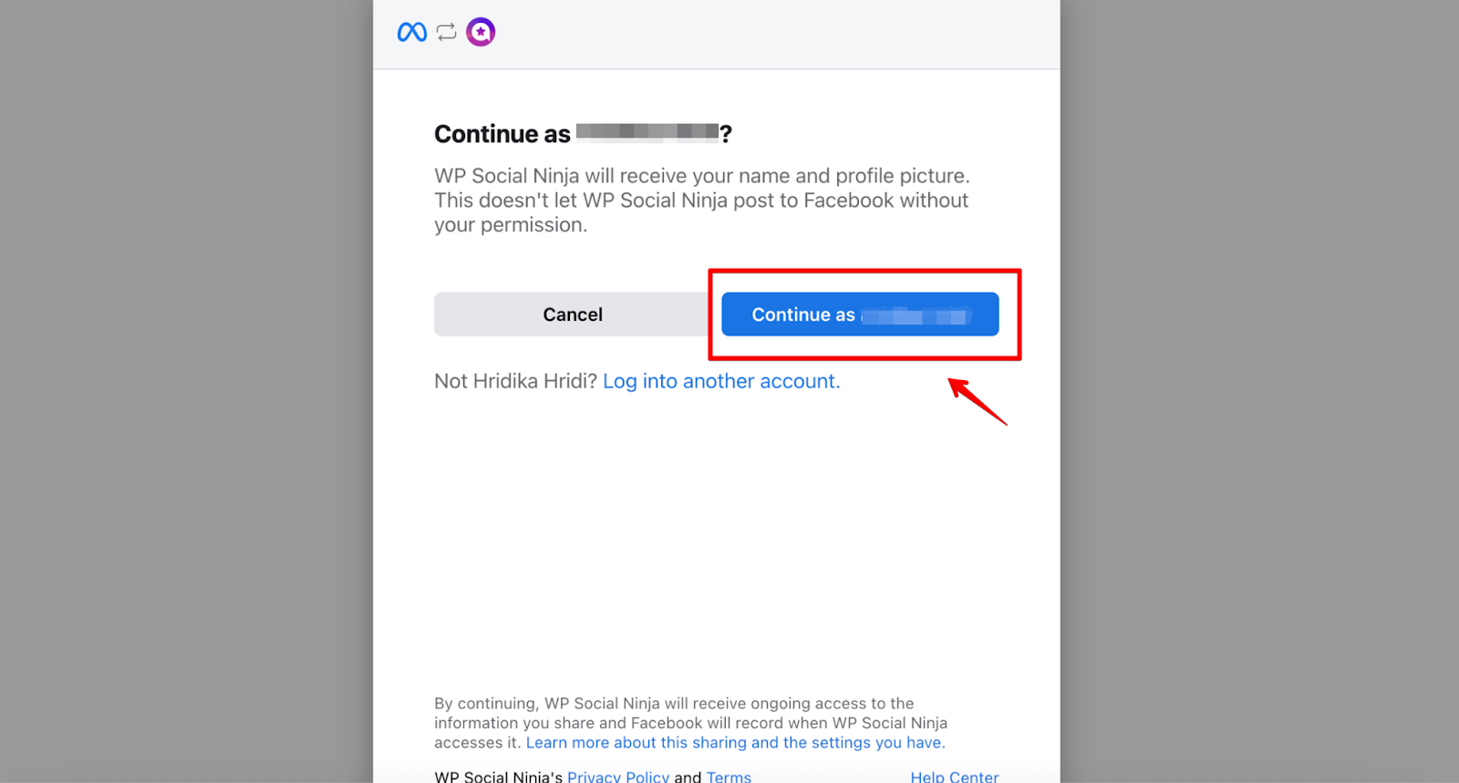 - Next, click on the Continue as (Your Account Name) button to connect the business account